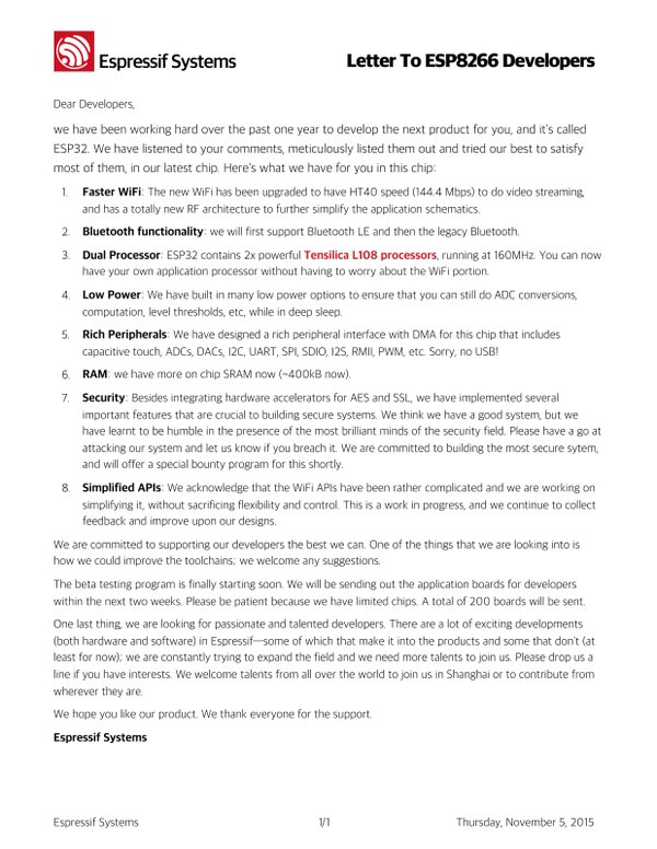 • Support – Espressif is a small company as far as we knew – would they be able to support both chips in the long term?